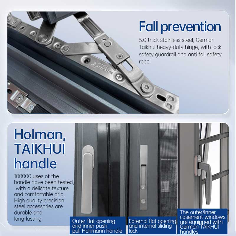Piilotettu salaojitusrakenne on kestänyt rajujen myrskyjen kokeen. Viemärireiät ovat hyvin piilossa. Tyhjennysaukon rakennetta voidaan suurentaa tyhjennysmäärän ja -nopeuden lisäämiseksi. Se ei ainoastaan takaa yleistä estetiikkaa, vaan myös estää tehokkaasti sadeveden tunkeutumisen huoneeseen ilman melua. 304 King Kong mesh tai erittäin läpäisevä verkko tarjoaa varkaudeneston ja hyttyssuojan. Tuotetiedot heijastavat erinomaista laatua, mukaan lukien putoamisen estävät turvasaranat, antibakteeriset kahvat ja terävä muotoilu, jotka tarjoavat kattavan turvasuojan perheellesi.